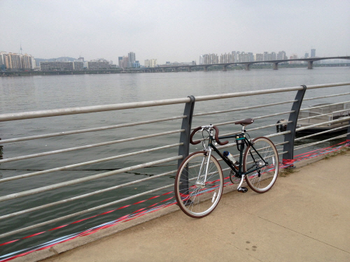 라이딩 : 그동안 스쿠터를 타고 다녔고 자전거를 탄지고 10년은 넘은것 같습니다. 그래서 인지 아직 많이 어색한점이 많이 있더군요. 튼히 핸들포지션이 오래전에 타던 일반자전거와 조금 달라서 어색한 점도 있긴합니다. 상단을 잡기에는 일반 일자 핸들보다는 많이 좁고, 하단을 잡기에는 아직 익숙한 포지션이 아니라서 힘들더군요. 뱃살의 압박도 있고.... 핸들 포지션도 적응해 나가면 괜찮을듯 합니다. 좁은안장이 오랜만이어서그런지 엉덩이도 조금 아프지만 시간이 지나니 조금씩 적응이 되긴 합니다. 처음 자전거를 살떄부터 내가 무슨 자전거 레이싱 할것도 아니고 기어단수는 중요하게 생각하지 않았습니다. 7단이라면 조금 적게 느껴지는데 실제 타보니 충분합니다. 덕분에 오랜만에 한강 나들이도 즐겁게 했습니다.