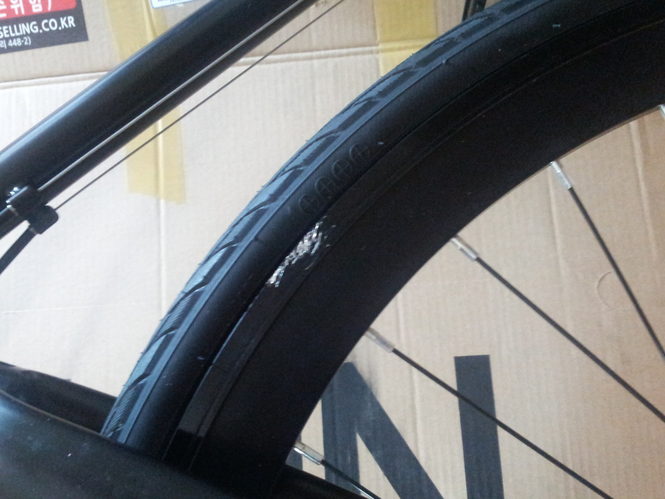 자전거 처음받았을때 450은 보니까 바퀴에 저런 기스가 있었습니다 타는데 지장없으니 그냥 타려고 합니다 !