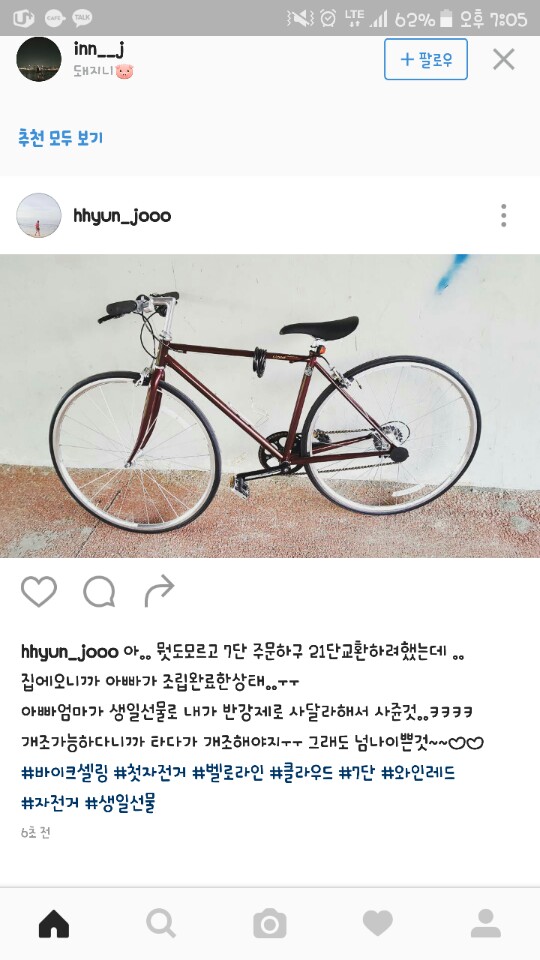 근데 남자친구가 본인 자전거는 21단을 사놓고선 제껀 단수는 안보고 ㅡㅡ
