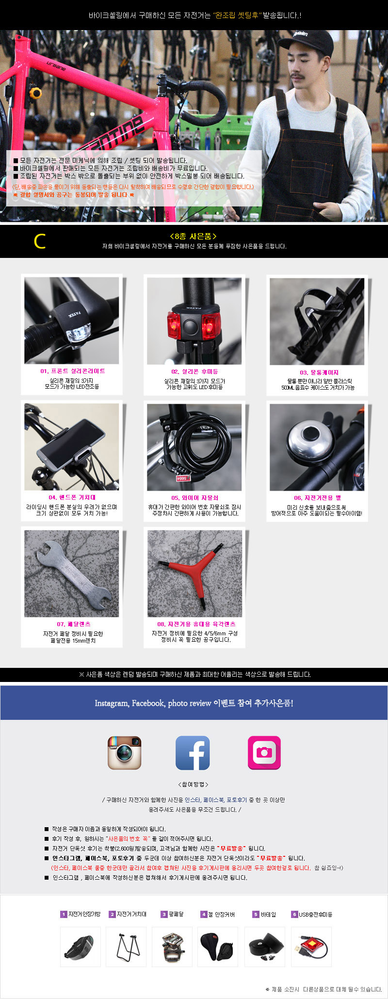 -당사 전문미케닉의 조립 및 셋팅이 완료된 상태로 포장 발송을 위해 핸들과 페달만 재분리되어 배송되며 받으신 후 바이크셀링 홈페이지 제품 상세페이지 하단의 조립 방법을 참고하여